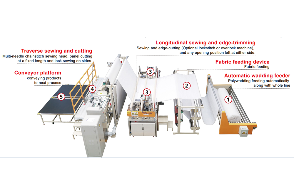 Connecting with Richpeace L1500 high speed multi-needle quilting machine and Richpeace automatic tape binding machine. Realized fully automatic production line for multi-needle quilting pattern comforter with tape binding.
