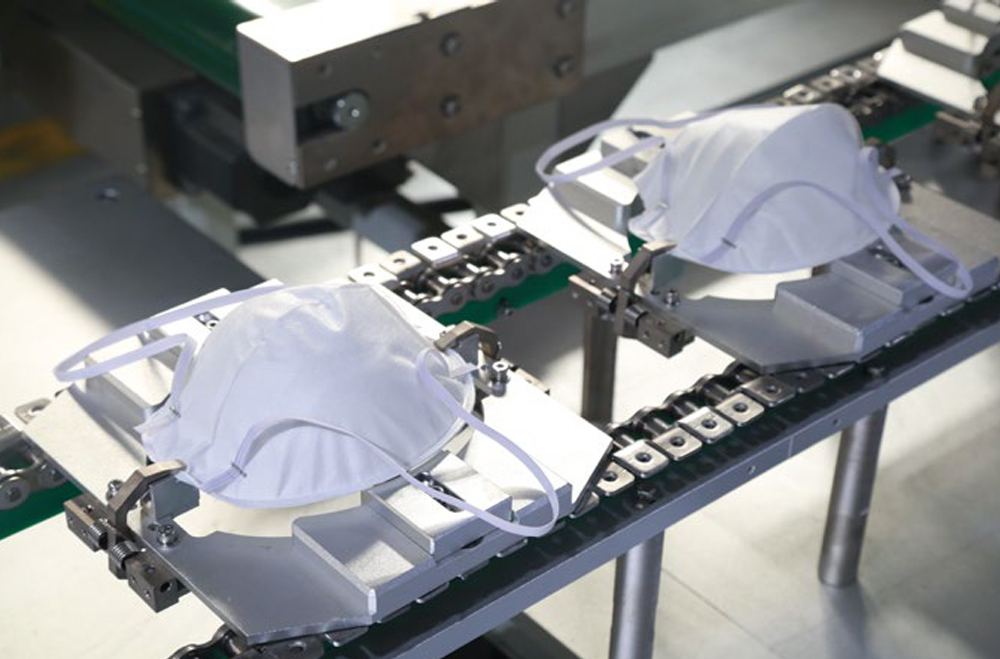 1. Fully automatic production line includes raw material feeding, cup forming, filter layer pre-forming, edge sealing and cutting, transferring to pad printing, sponge strip sticking, automatic external nose clip, headband stapling (optional headband welding), ultrasonic breath valve welding (optional), Manipulator grab and mask transmission.