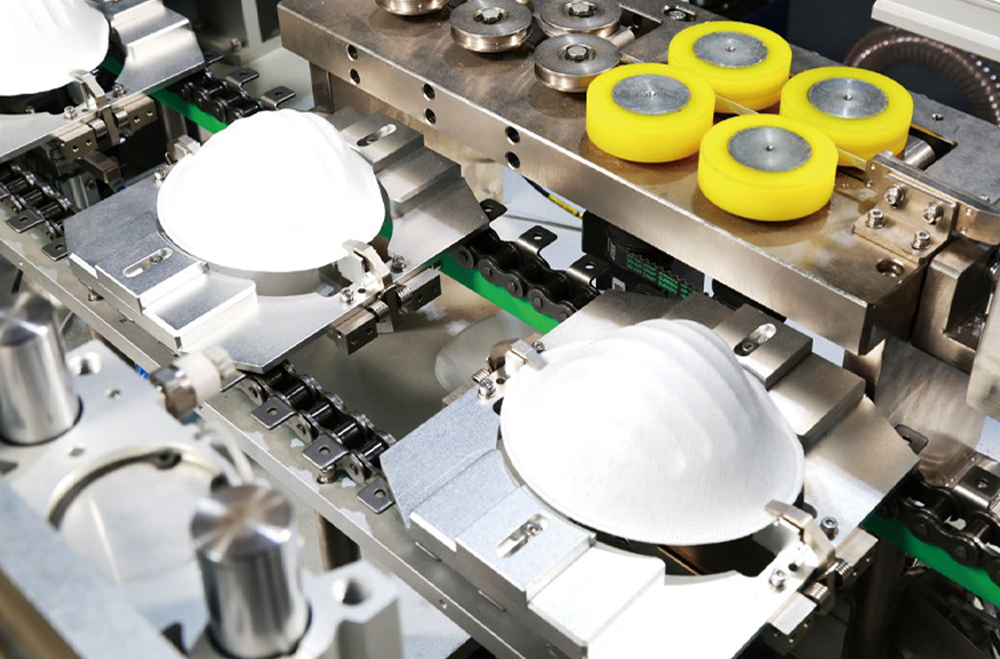 1. Integrated design, fully automatic production from feeding raw materials to cup forming, cup border welding & cutting, automatic transferring to outer nose clip, automatic transfer pad printing, headband stapling (optional headband welding ), ultrasonic breathing valve welding (optional), manipulator grab and automatic convey, etc.