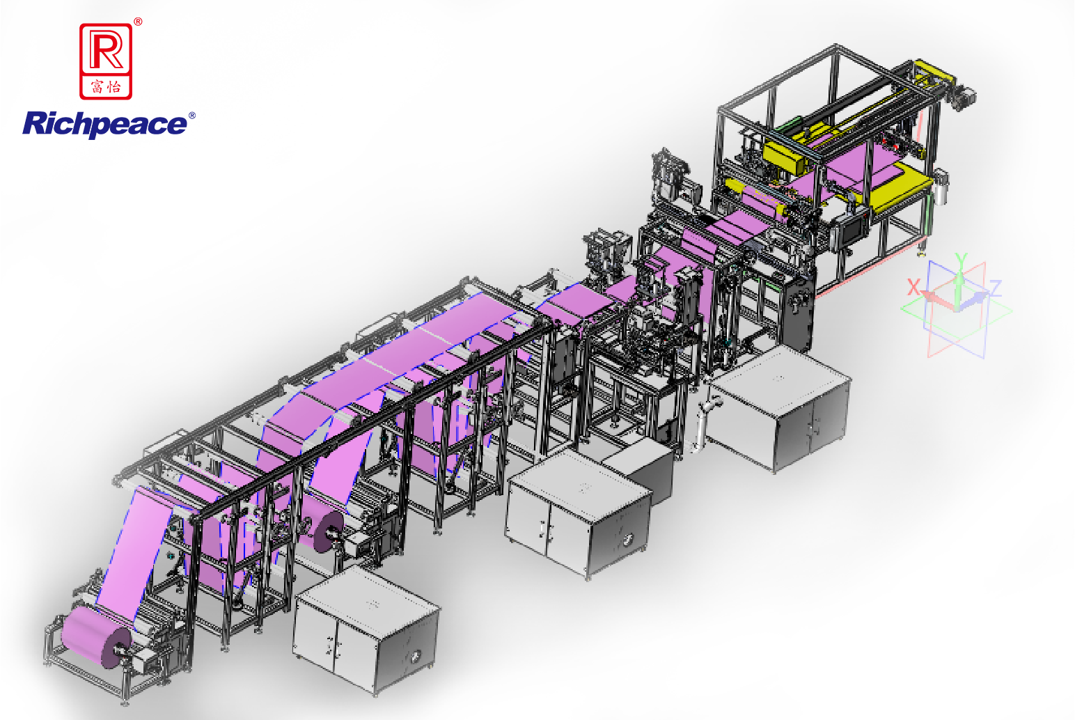 The production line is the combination of feeding mechanism, both sides edge sewing mechanism, both sides sealed sewing mechanism, single side cross-sewing mechanism and collecting mechanism.