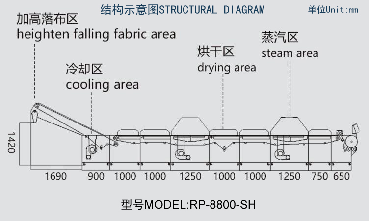 1. Adopt strong cooling device, quickly cooling fabric, stabilize fabric size. With Heighten falling fabric device, especially suitable for textile factory.