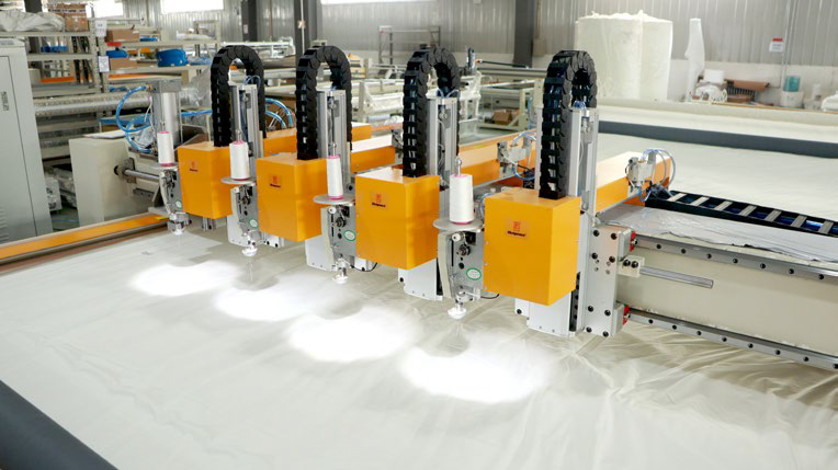 2. Fully automatic production line from the fabrics and padding feeding to panel quilting and four sides cutting and four corners forming.