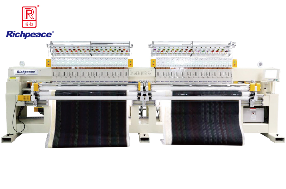 3. Dual-needle quilting head with min.needle distance(50,8mm, 2inches); needle bar can be independently or manually controlled, freely activating or locking. Head interval selection function is adaptable to the production requirement and complicated or combined patterns production.
