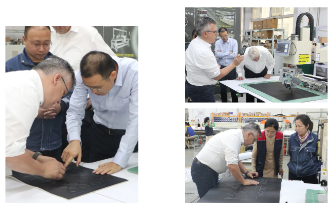 Under Chairman Huang Hai's guidance, the German delegation toured the sewing equipment assembly workshop, where they were impressed by the fully automatic leather random-turn sewing machine. They also visited the quilting, cutting, and embroidery workshops, as well as the heavy-duty parts, precision processing, and painting workshops, gaining insight into Richpeace's intelligent manufacturing system.