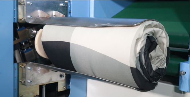 Suitable for rolling and packing of fluffy items such as quilts, pillow, cushion, etc, to reduce the volume and storage, as well as lower transportation cost. Packing item is auto-feeding from backward to forward by the belt during the compressing process, and rolled to pack into the bag.